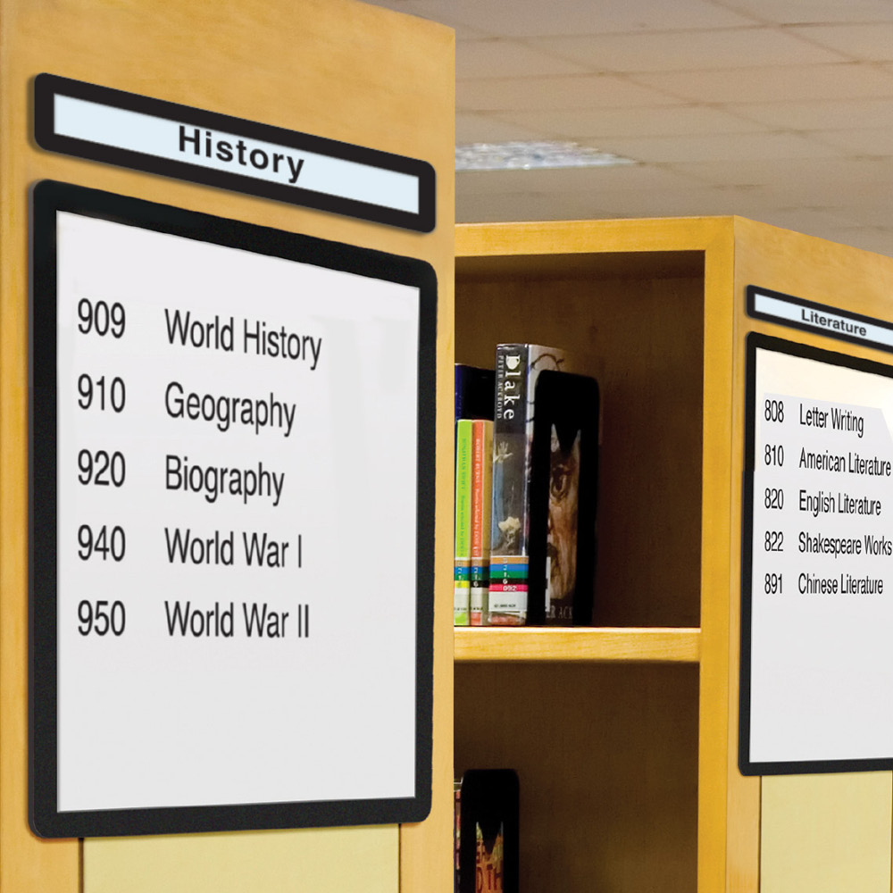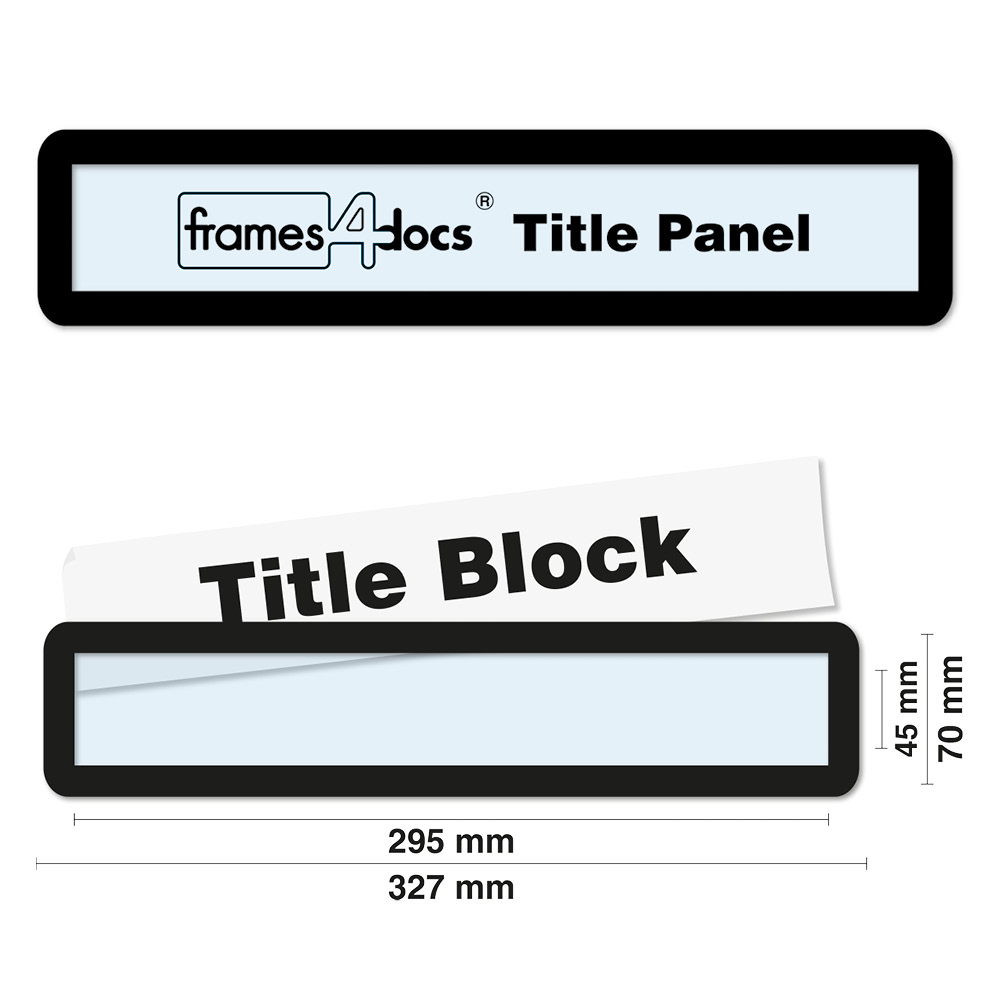 Each title block is 327 wide x 70mm high overall to accept inserts 295x45mm, these header strips help highlight what information is being shown The design allows for easy insertion and removal of documents without the necessity of moving the frame.